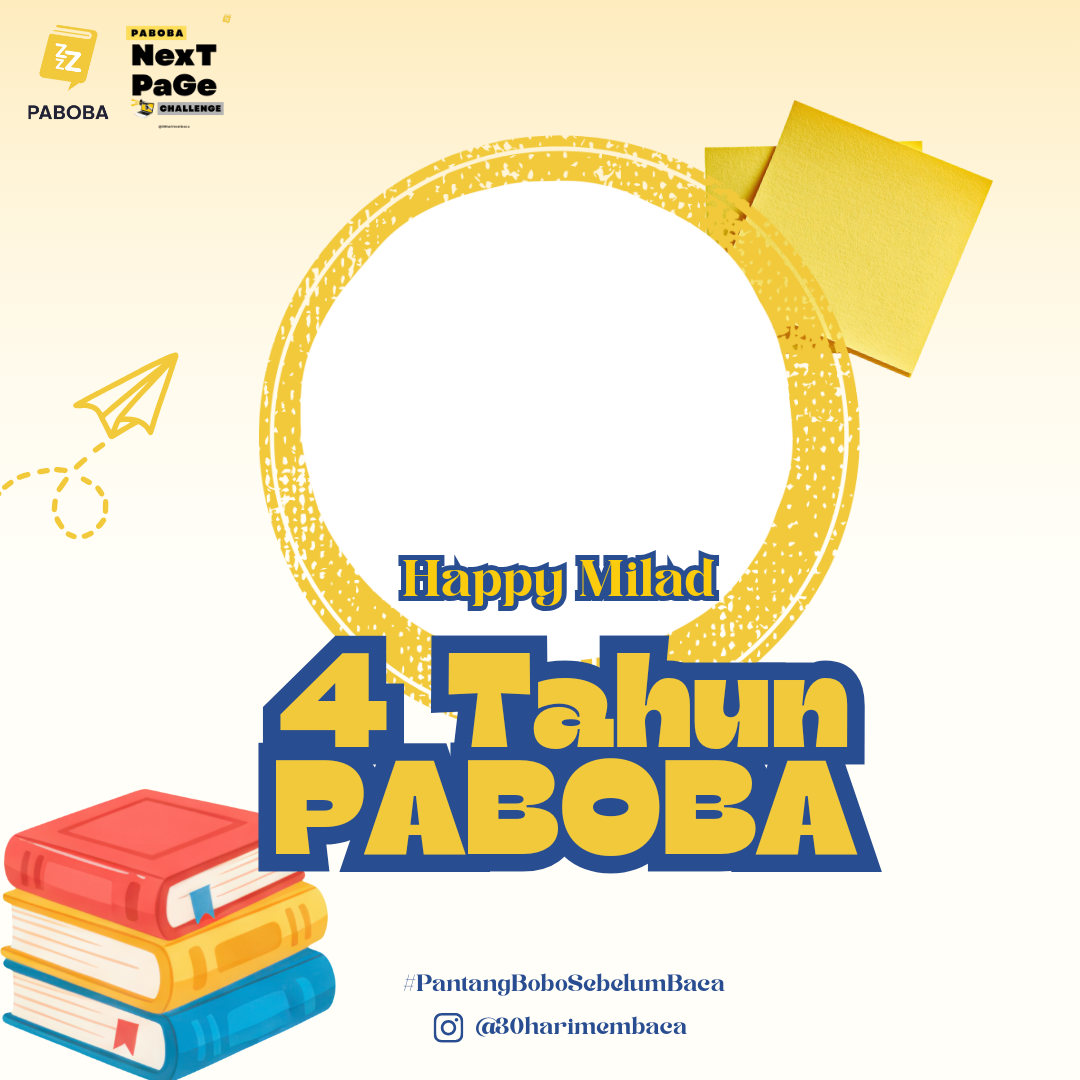 Happy Milad 4th PABOBA! Mari terus melangkah ke halaman selanjutnya (NexT Page) dengan penuh semangat. Gunakan Frame ini sebagai bentuk dukunganmu untuk literasi Indonesia! 🇮🇩 #PantangBoboSebelumBaca #4TahunPABOBA #Literasi #NexTPageChallenge